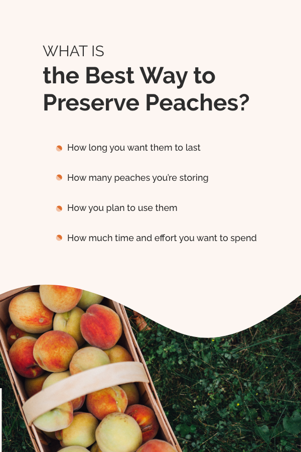 - How you plan to use them: Some preservation techniques change the texture and flavor of your peaches. If you want your peaches to taste the same as the day you picked them, canning or freezing are the best methods.