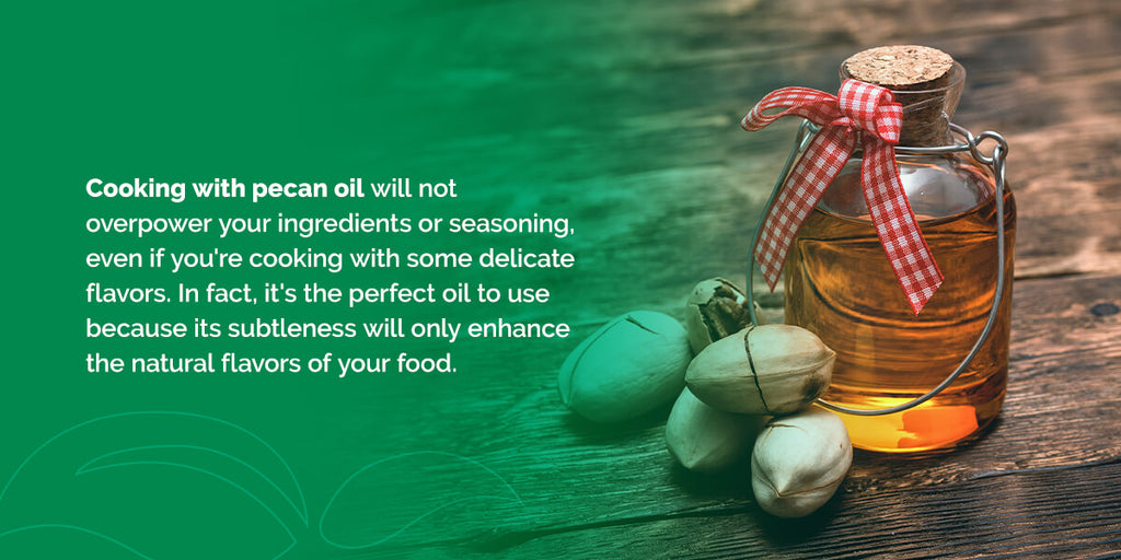 If you're hesitant to use a nut oil for certain dishes, know that pecan oil actually has a very neutral nutty taste, meaning it's not as distinct as olive oil. Cooking with pecan oil will not overpower your ingredients or seasoning, even if you're cooking with some delicate flavors. In fact, it's the perfect oil to use because its subtleness will only enhance the natural flavors of your food.