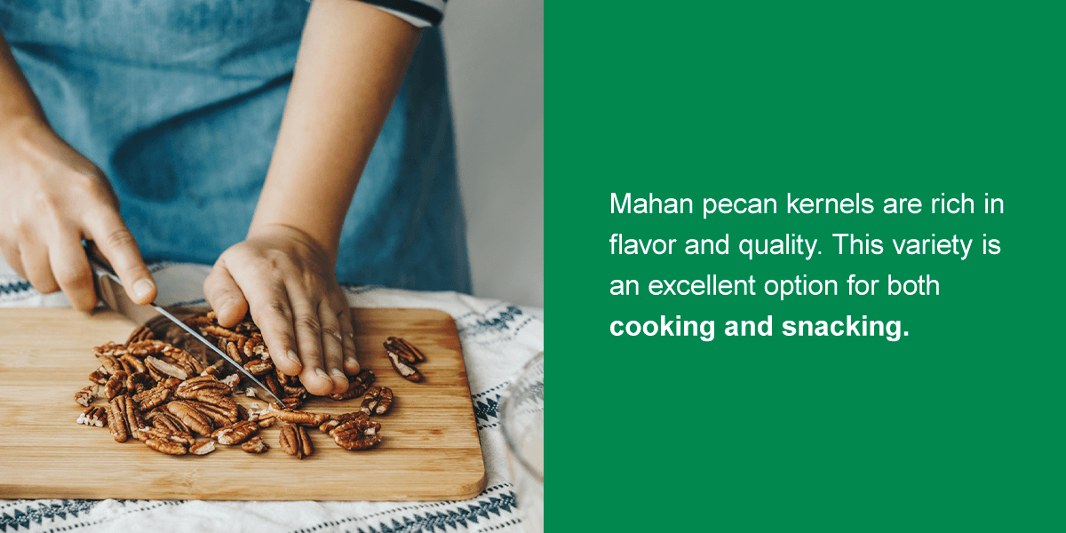 Identified by its large size and soft, thin shell, Mahan pecan kernels are rich in flavor and quality. This variety is an excellent option for both cooking and snacking.