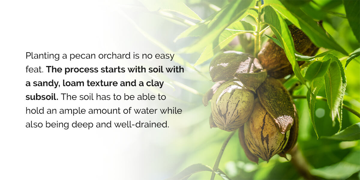 Planting a pecan orchard is no easy feat. The process starts with soil with a sandy, loam texture and a clay subsoil. The soil has to be able to hold an ample amount of water while also being deep and well-drained. Typically, the land should be level, but gentle slopes can work just as well.