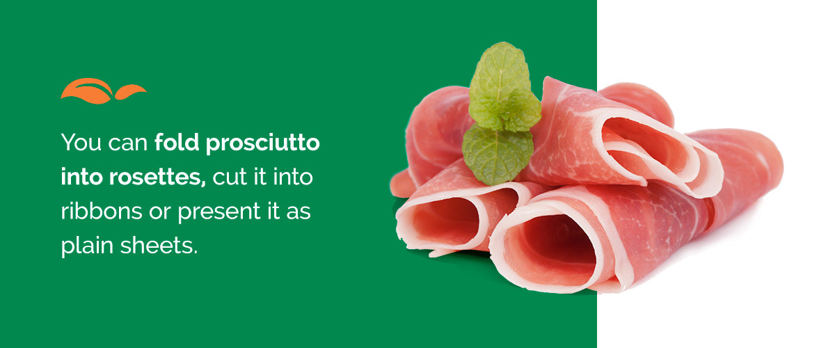- Prosciutto: Prosciutto is a mainstay of charcuterie boards. Its salty flavor and delicate texture pair well with aged cheeses and sweet fruits. You can fold prosciutto into rosettes, cut it into ribbons or present it as plain sheets.