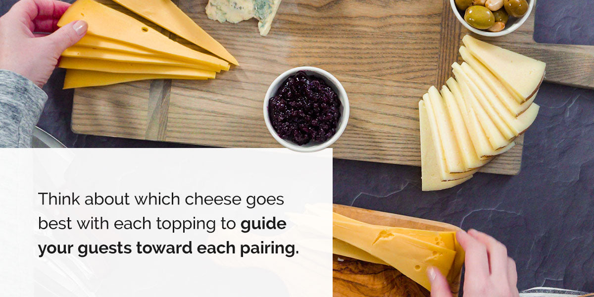 - Cheeses: Add one or two cheeses next to each ramekin. Think about which cheese goes best with each topping to guide your guests toward each pairing.